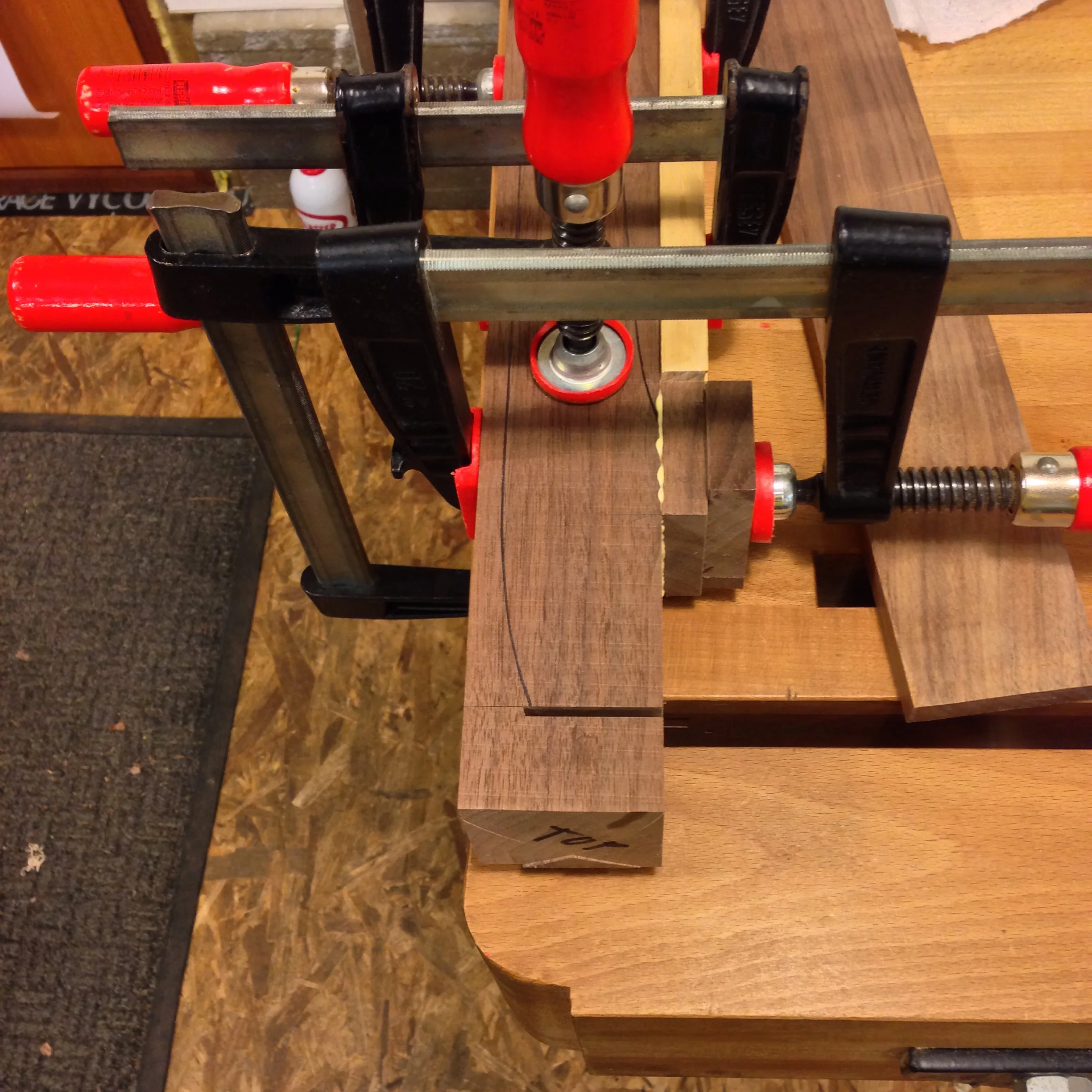 With the mortises routed, the next step is to glue blocks onto the two inside faces of each leg. These blocks provide the additional leg material needed to make the small miters where the aprons join to the legs. May not make sense now, but it will in a few posts.