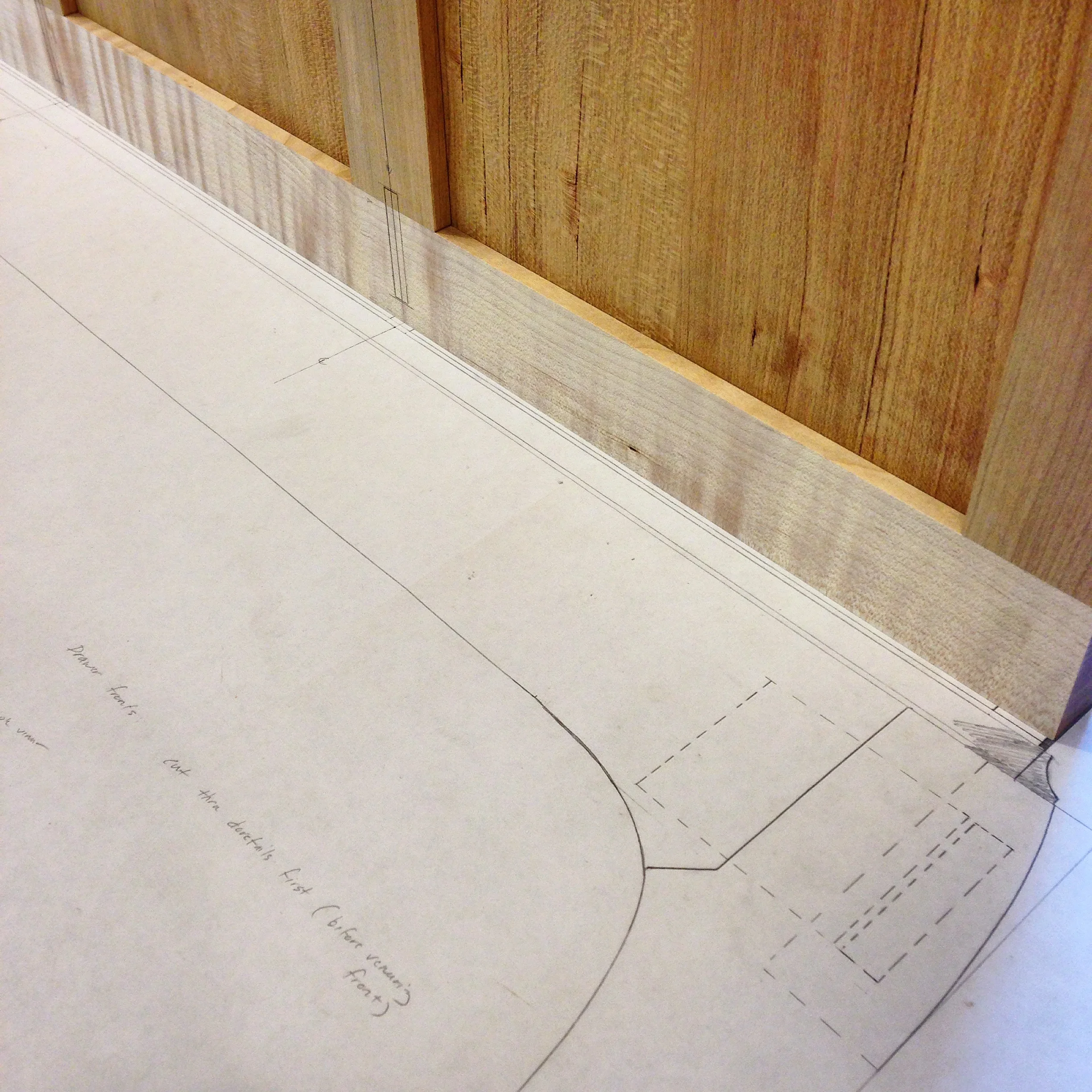The next step on the case bottom is to cut the mortises that will receive the stub tenons on the four vertical dividers (one front and one rear divider for each partition). I used the full scale drawing to locate partition centerlines on the case bottom. Once all mortise locations are laid out, I'll freehand cut them with a palm router.