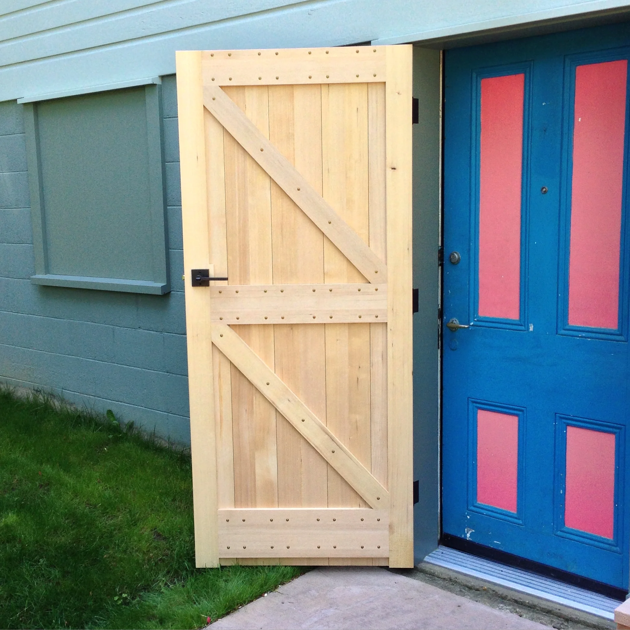 First, let me apologize for yesterday's poor image. I re-read the post later in the day and realized how bad the image was. Here's a view of the inside of the door, where the construction details become evident. The door's racking resistance comes from the interior frame, made of two vertical stiles, three horizontal rails and two braces. If you remember, the rail to stile joinery is epoxied threaded rod. Together with the braces, the frame is extremely rigid and will never sag. Also, by gluing the first and fifth exterior boards to their respective stiles, the net stile thickness is around 1.5" of very stable material. The gist: this is a very lightweight, strong and stable door. Oh yeah, it looks pretty good too (or at least better than the door it's covering up).