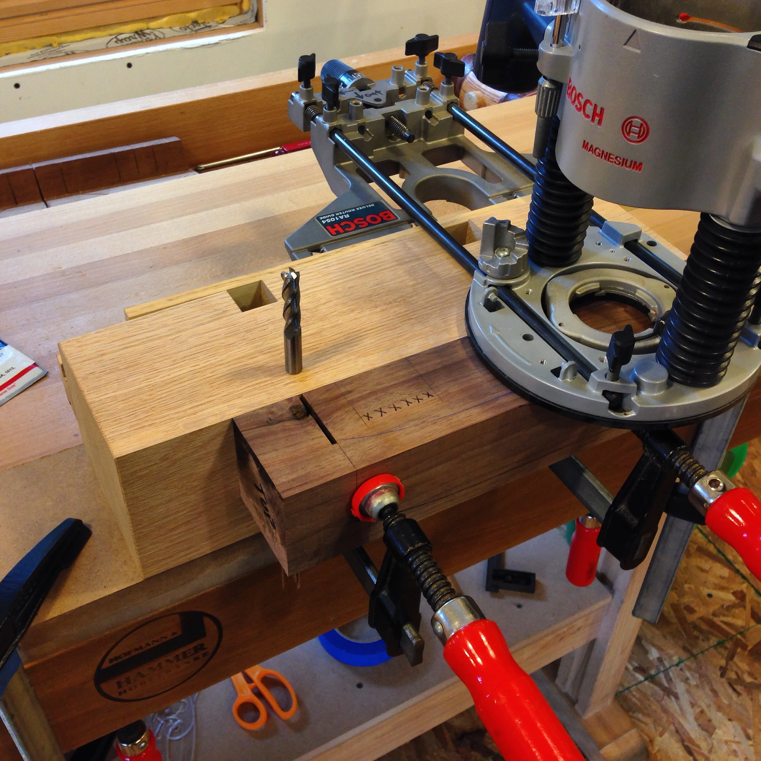 After layout, it's time to rout the mortises. My setup is pretty simple, but effective. The only difference is this time I'm using an end mill instead of my normal spiral router bit. I've been wanting to try end mills for a while and it was time to retool so I thought I'd give them a try.
