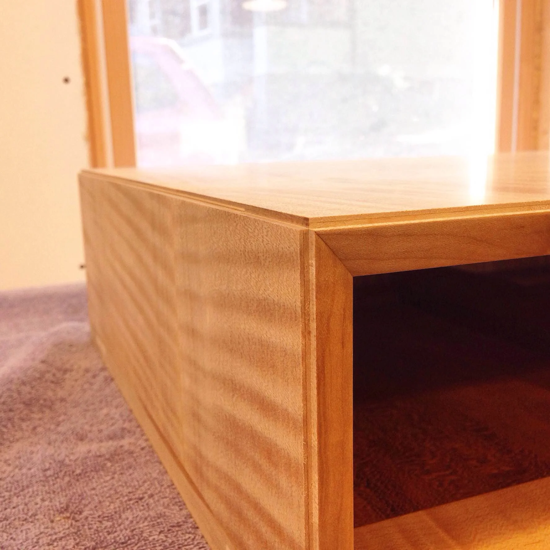 Back after a week in lovely Rockland, Maine. I'm working on the rosewood edging that will be applied to all visible corners of the case. The first step was to build a fixture for routing the edges to accept the rosewood edging. More on that fixture later, but here is the case, after routing the edges.