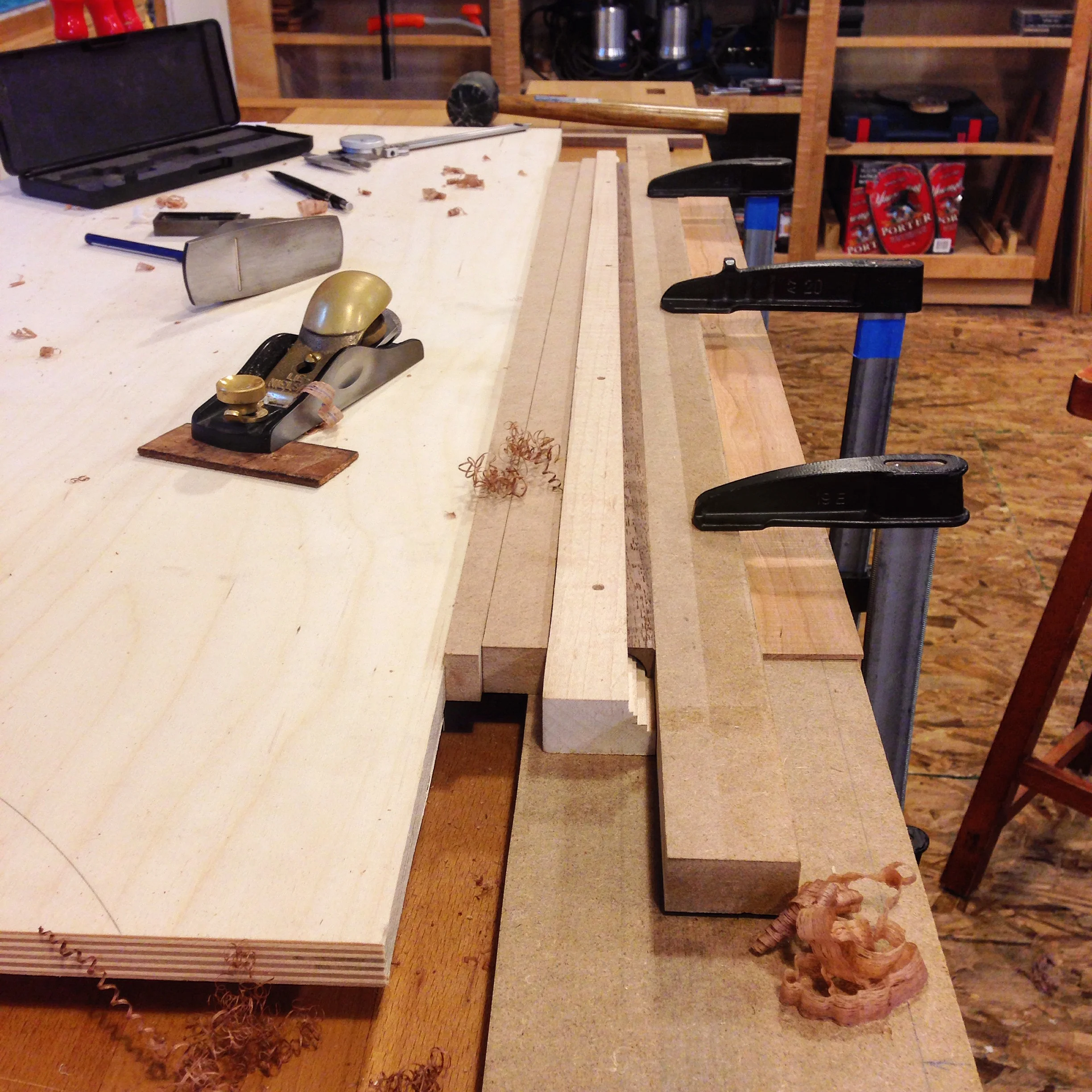 After hand planing the molding to a very consistent width, I decided to take a bit off the height. So here's the second setup I used to hold the molding so I could work the bottom edge. Again, constantly checking progress with a square and calipers.
