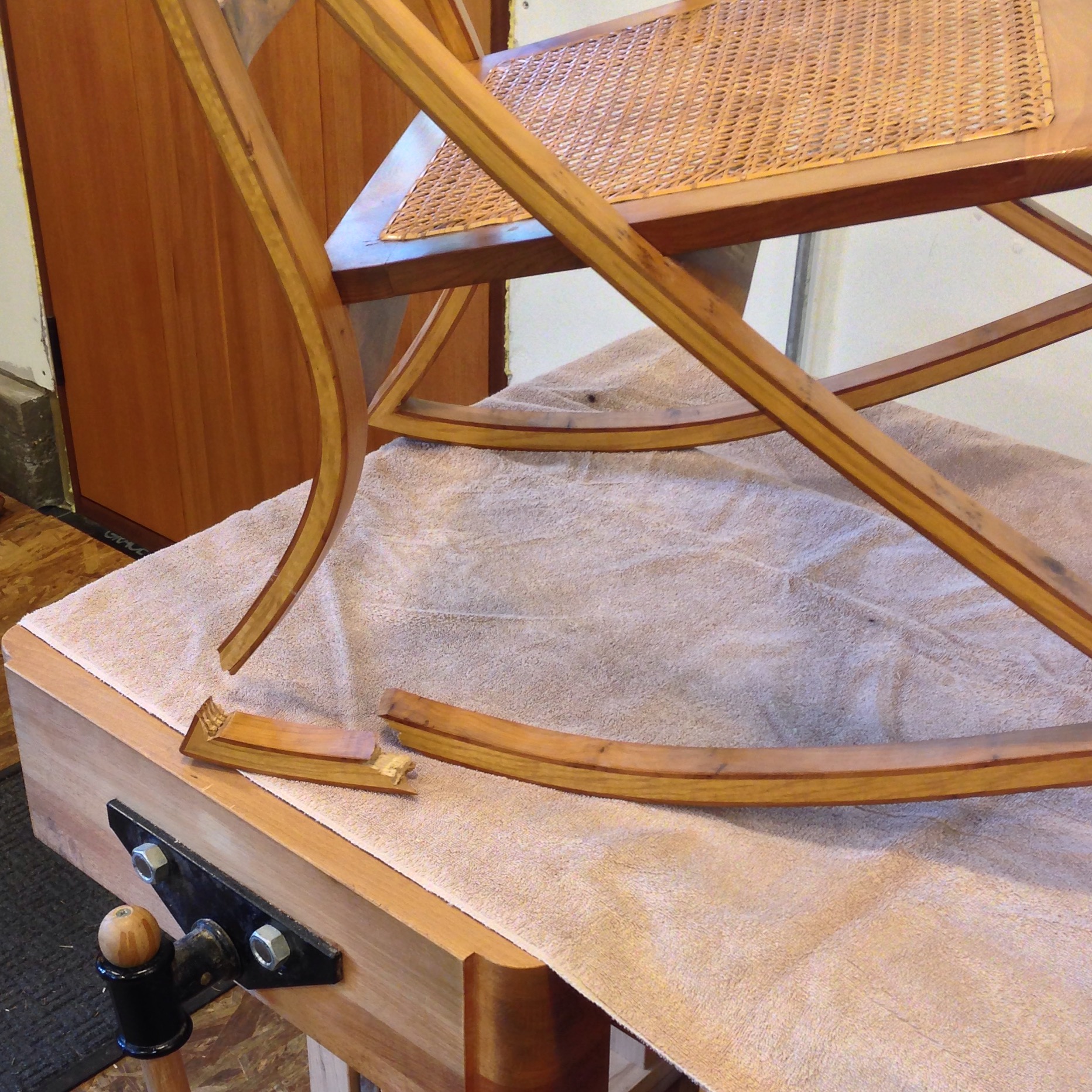 I'm back after a few days in the Mountain State. On the bench today is a repair of an English-made rocking chair. I occasionally take on repair projects and this one piqued my interest. It won't be an invisible repair as the owner wanted to embrace the repair, to make it part of the chair. Should be an interesting process.