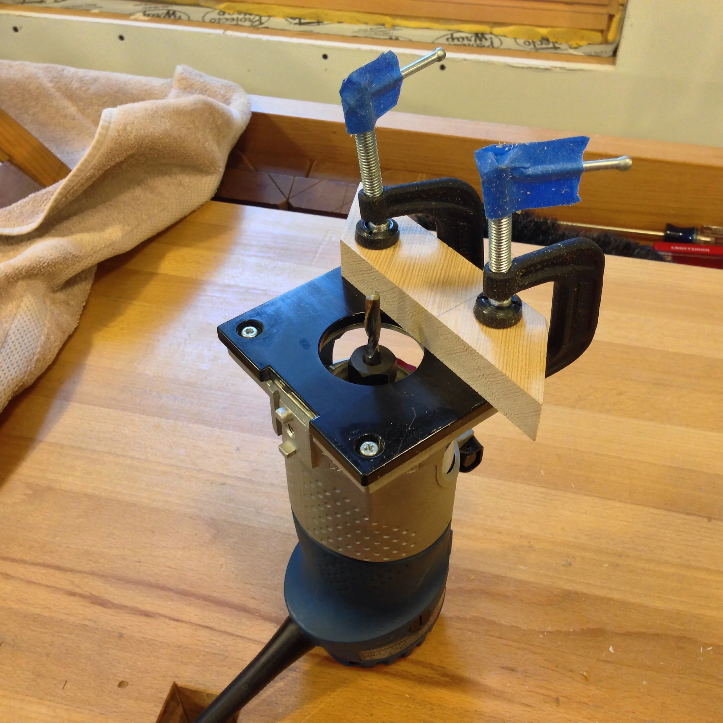 Here's the router setup used to cut the mortises from the previous post. The blue tape on the clamps keeps the sliding cross bars from rattling around and/or getting in the way.