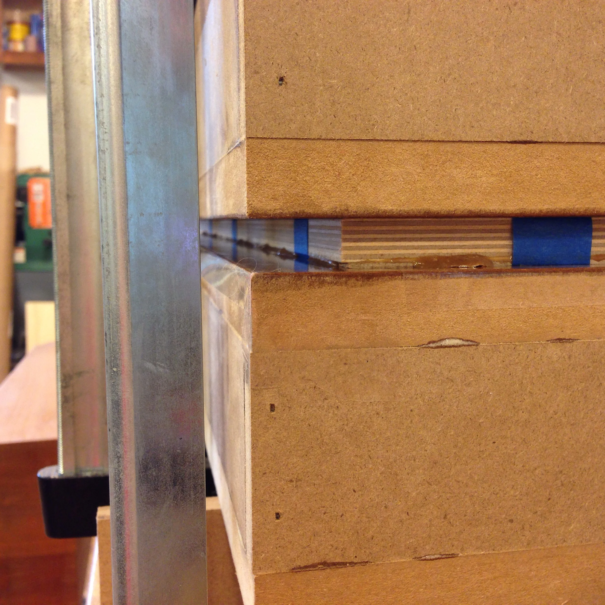 A Closer Look At Pressing August 12, 2016 Here's a look at the case top panel, sandwiched between platens. Nice consistent adhesive squeeze out.