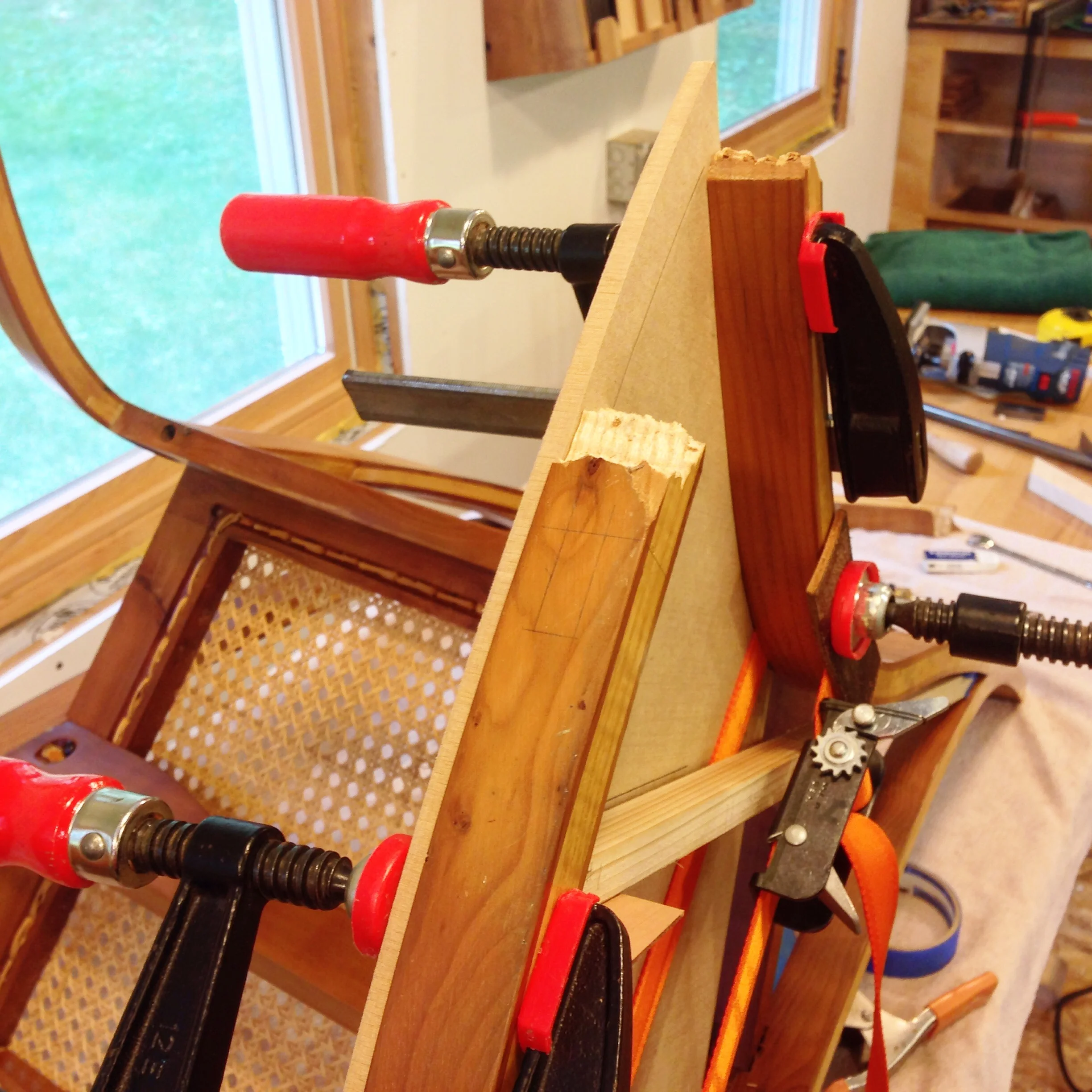 Next step on the rocker repair: layout. With the rocker stabilized with the setup from yesterday, I lay out the joinery in preparation for cutting.