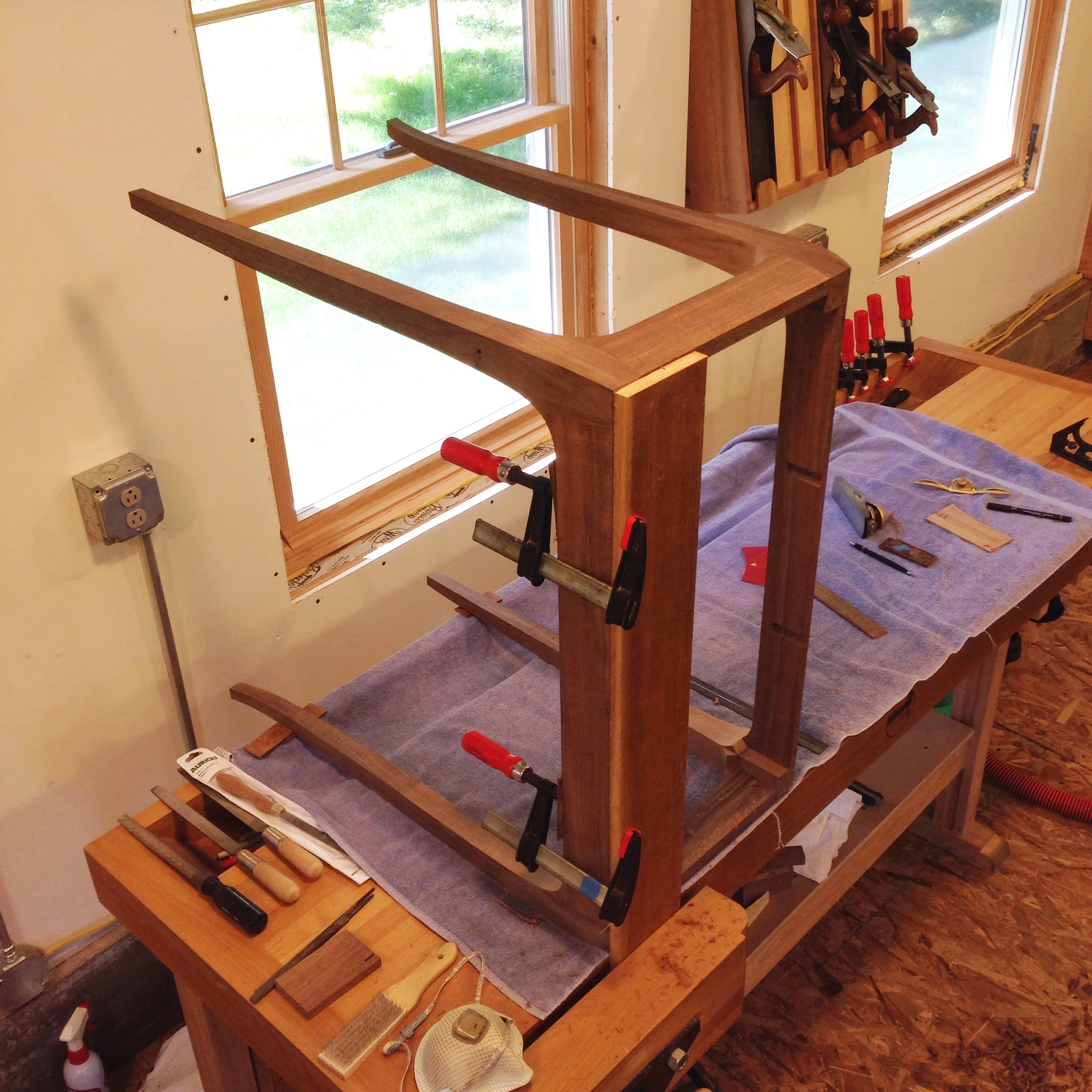 The base assembly was completed yesterday. After "resting" overnight to allow the glue to cure, it was back to cleaning up the side aprons and leg to apron transitions. My setup for working the side aprons got a little creative.