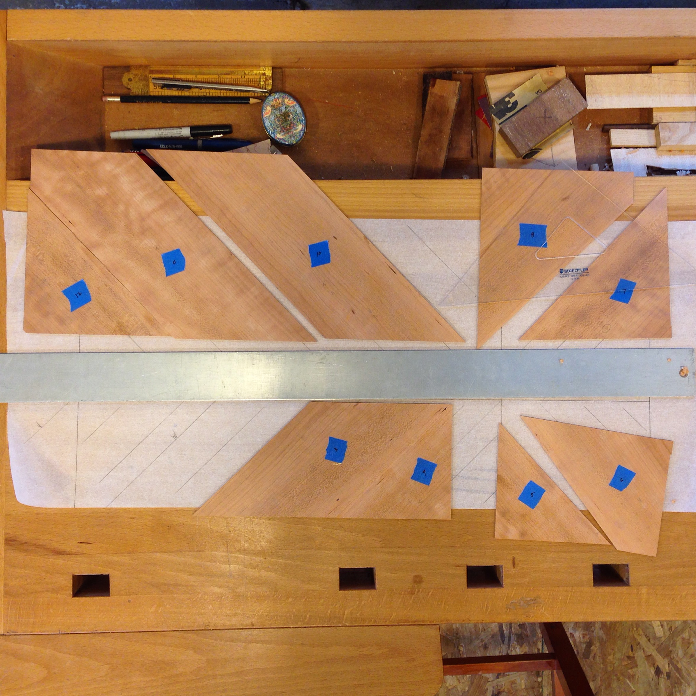 Today I'm working on the veneer layout for a small table top. I really enjoy this process of cutting and fitting veneers - using a block plane to work very precisely. Definitely a blue tape day.