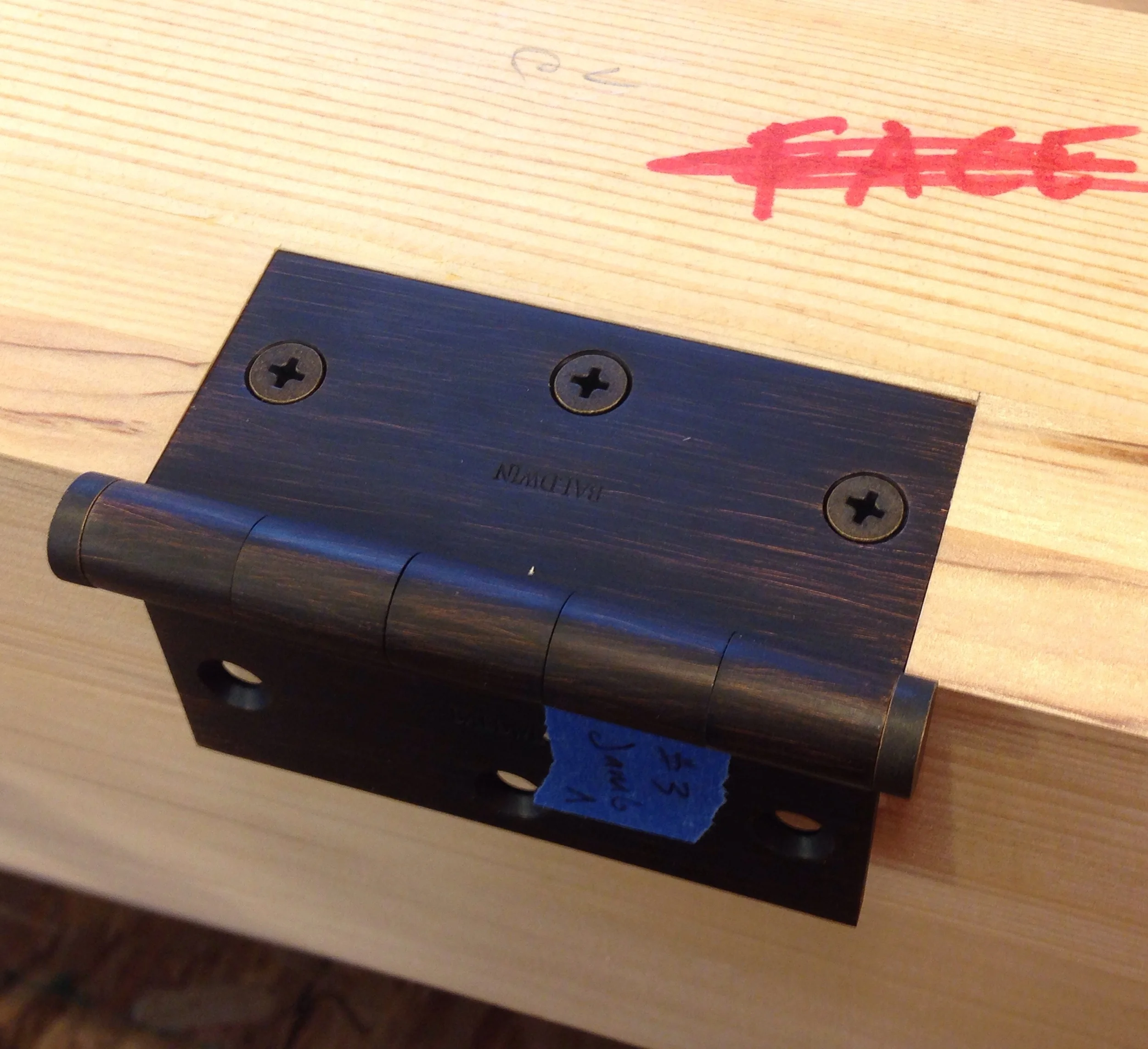 The hinges are laid out, marked, cut and screws pre drilled and installed. This is just a test fit, there's more work to be done before permanent installation of the hinges.
