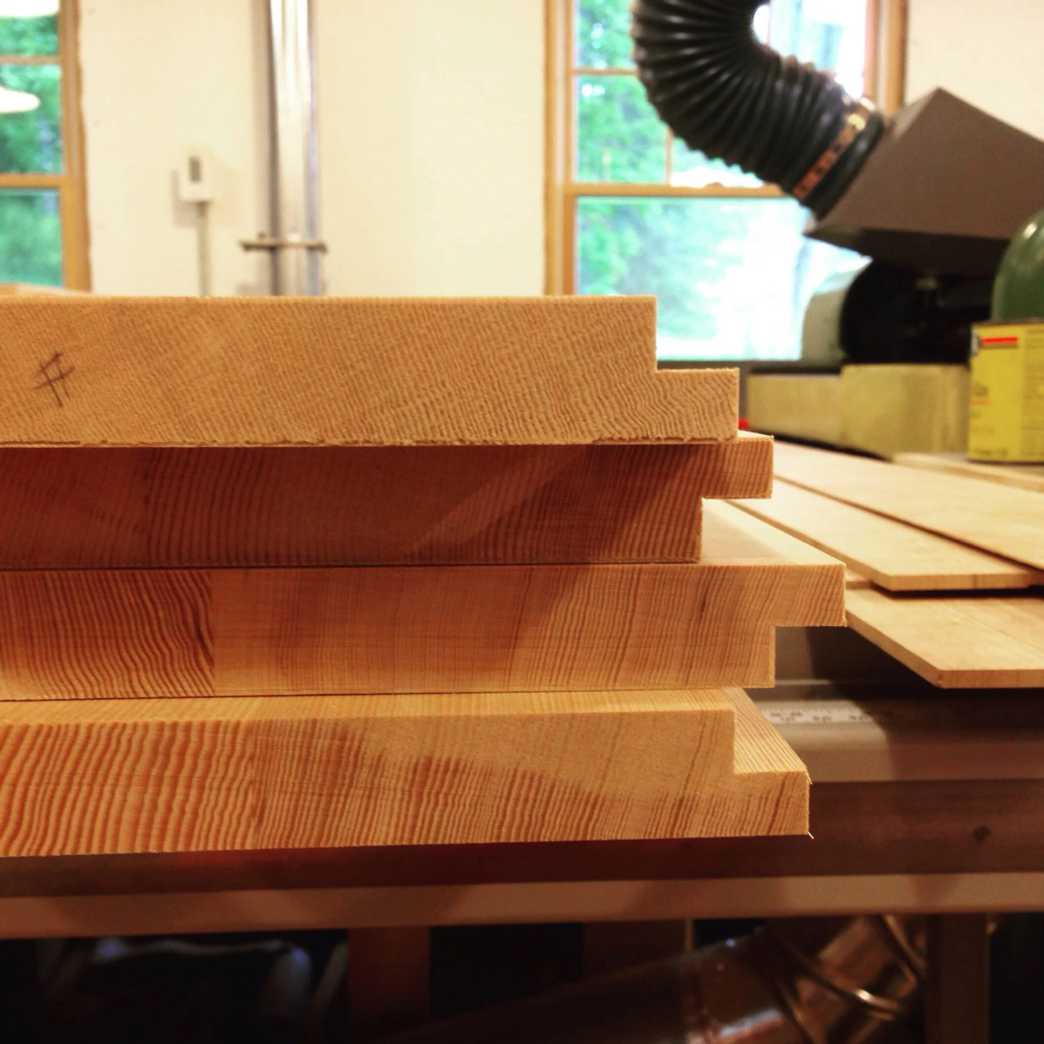 Here are the boards for the door, after milling the ship-lap joinery. This material is quartersawn white cedar, almost completely free of any defects and beautifully straight-grained. Really nice to work.