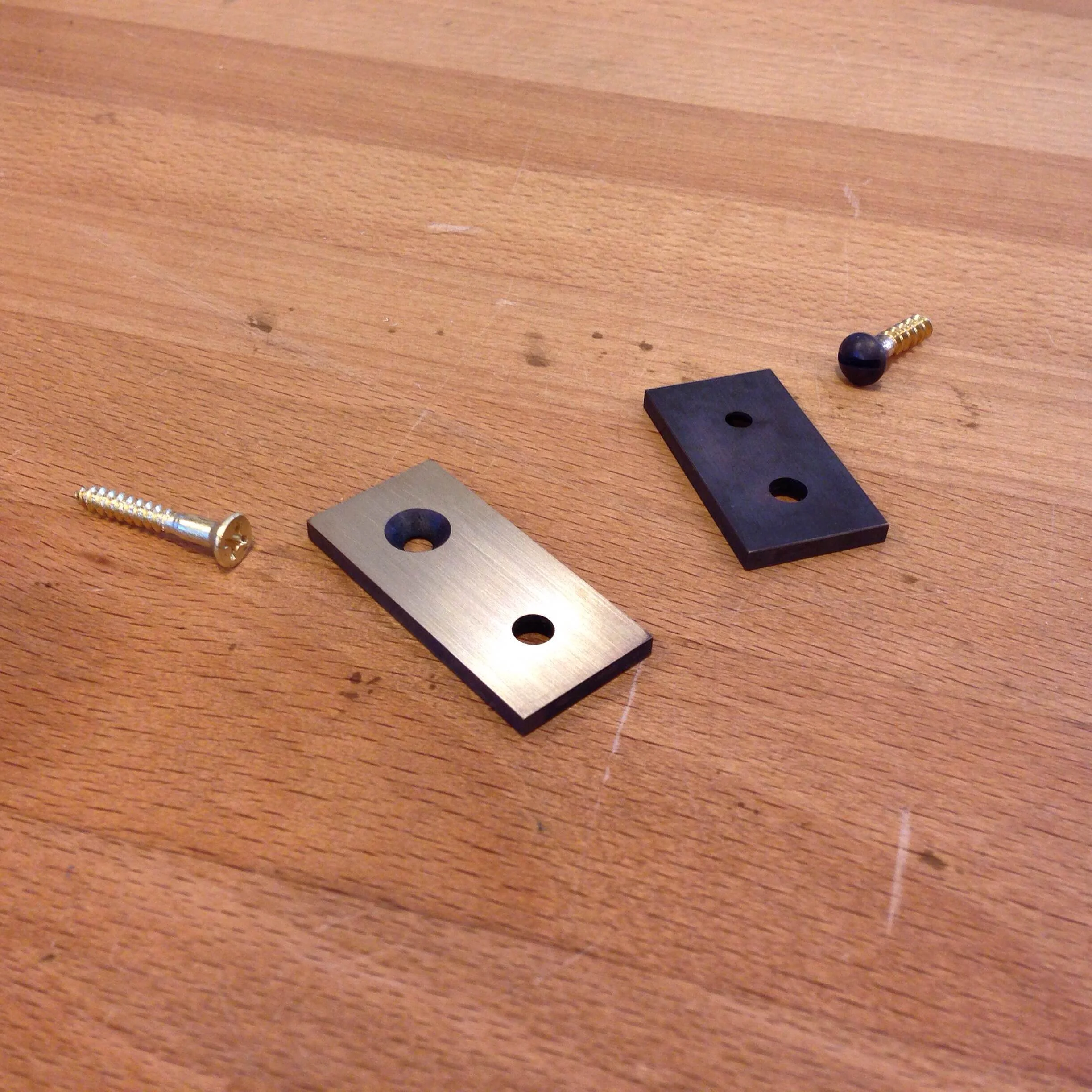 And then, because I can't seem to leave things alone, I decided that the bright brass, while sexy and elegant, might look better with a patina. I had some patinating solution from when I did the copper gutters on my studio. So now the visible surfaces and screw heads (right) have this really sweet patina. The unexposed faces of the tabs and hidden screws are bright brass (left).