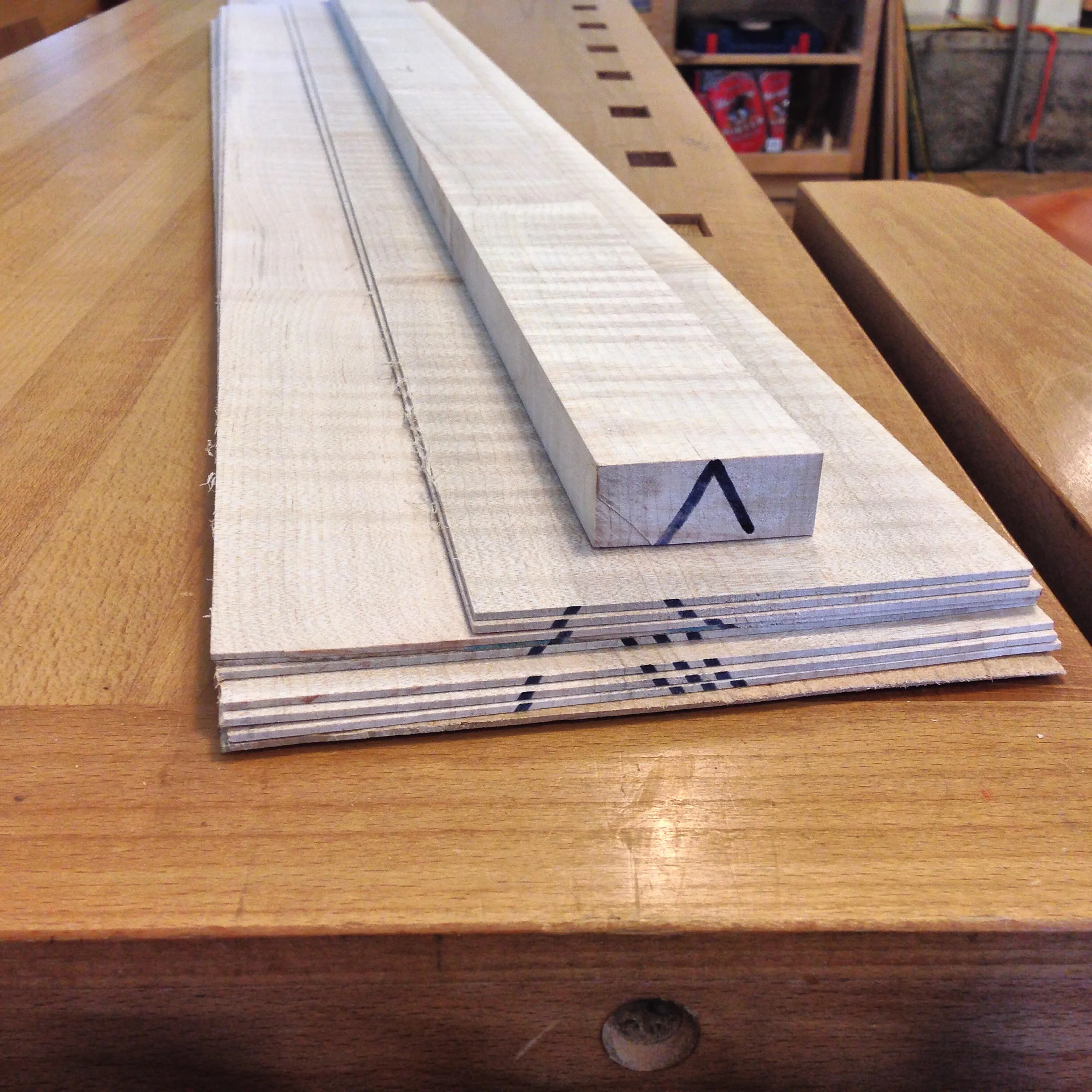 Slices of Maple June 30, 2016 A short stack of veneer and miscellaneous matched parts for the sideboard. A few more slices to go.