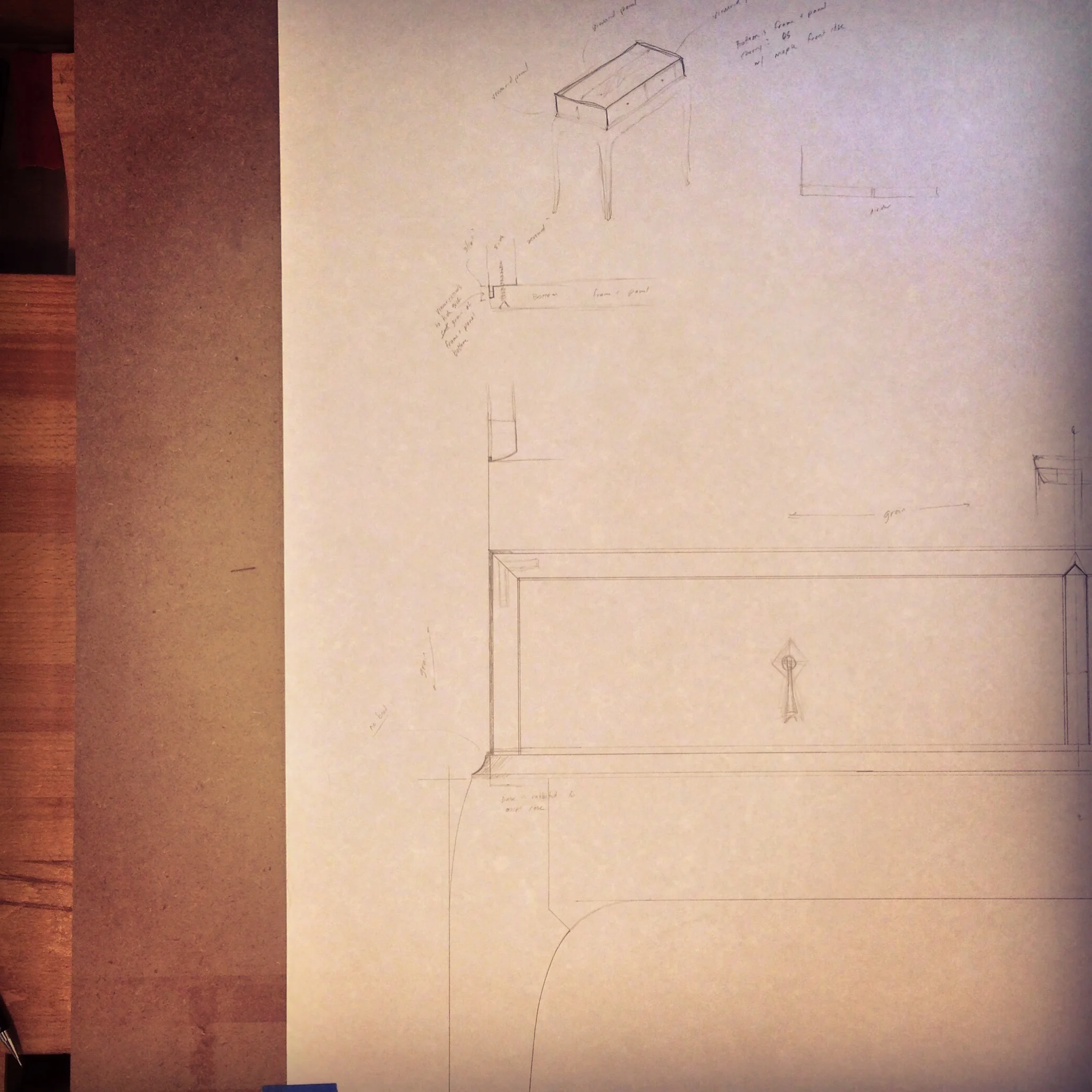 It's a design day for me, working on the next piece. Some details are still being worked out, but the piece is a sideboard. Anything can change at this point, but current thinking is a curly maple case on top of a walnut base.