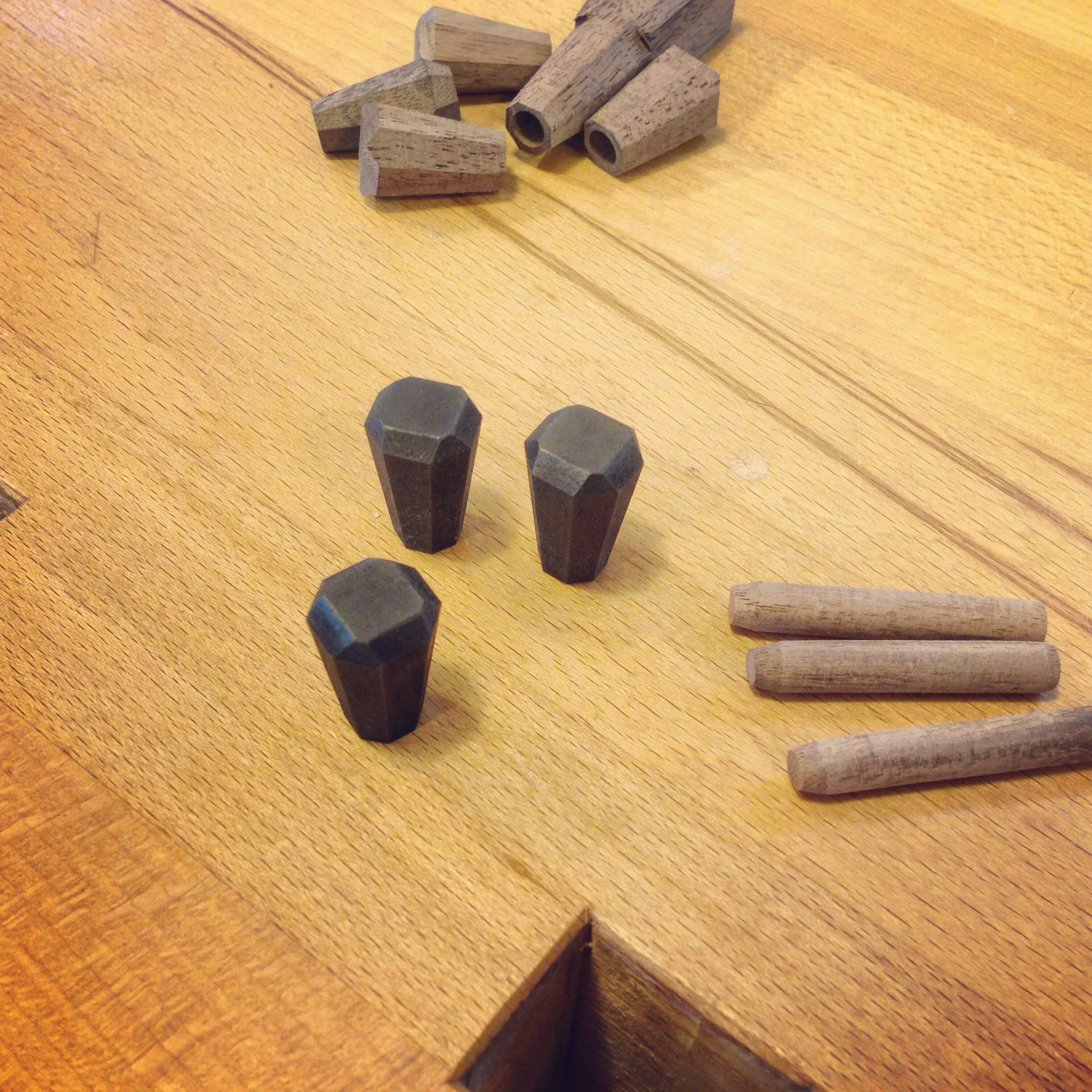 Gem-inspired drawer pulls. These will be attached with slip tenons (at right) since integral tenons would have gotten in the way of shaping the pulls by hand.