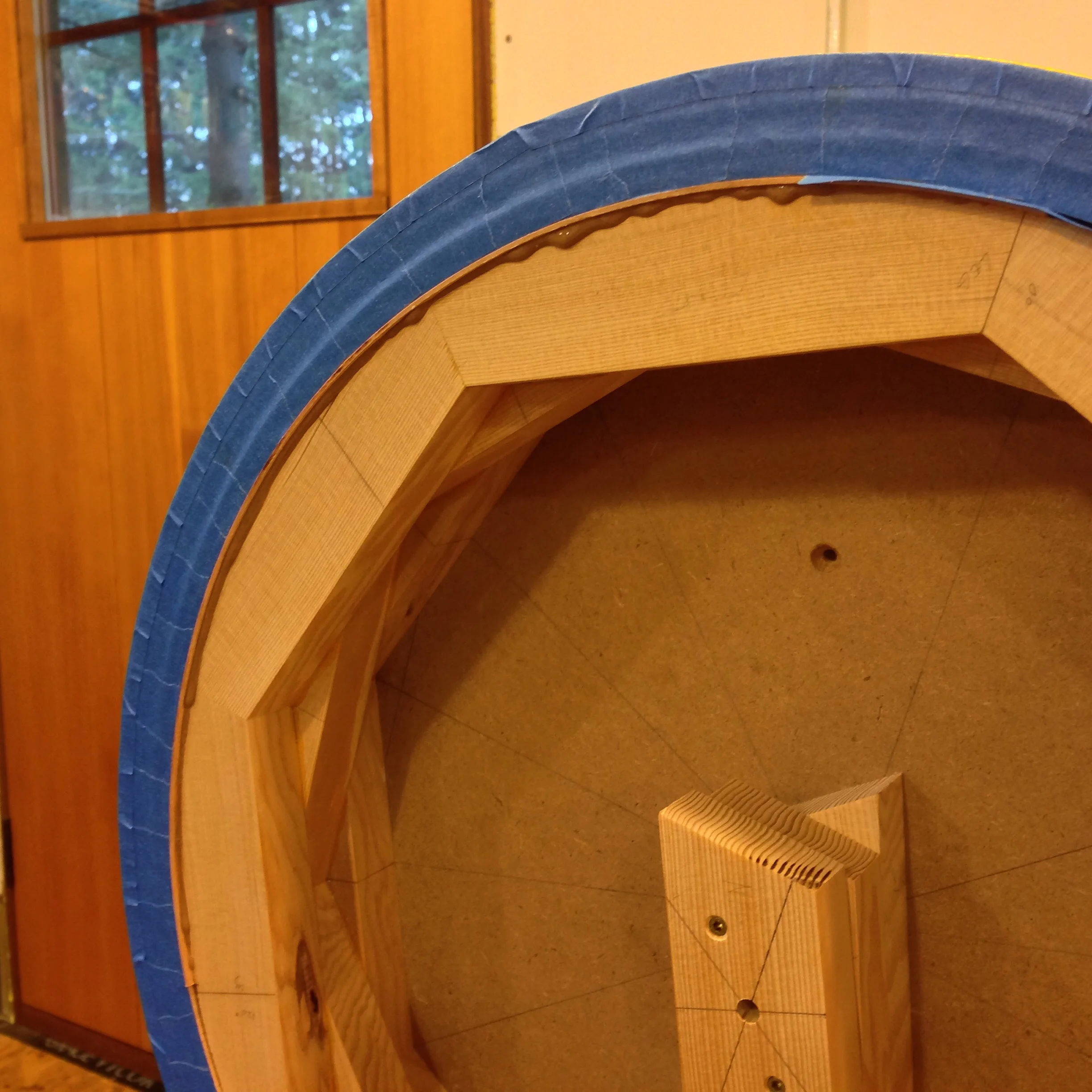 Here the veneer is being applied to the apron. I'm using a caul made of 3 layers of 3/8" bending plywood (whose edges are wrapped in blue tape to protect it from adhesive squeeze out). The 3 layer caul was glued up previously on the apron, so I didn't have to fight with them when working on pressing on the veneer.