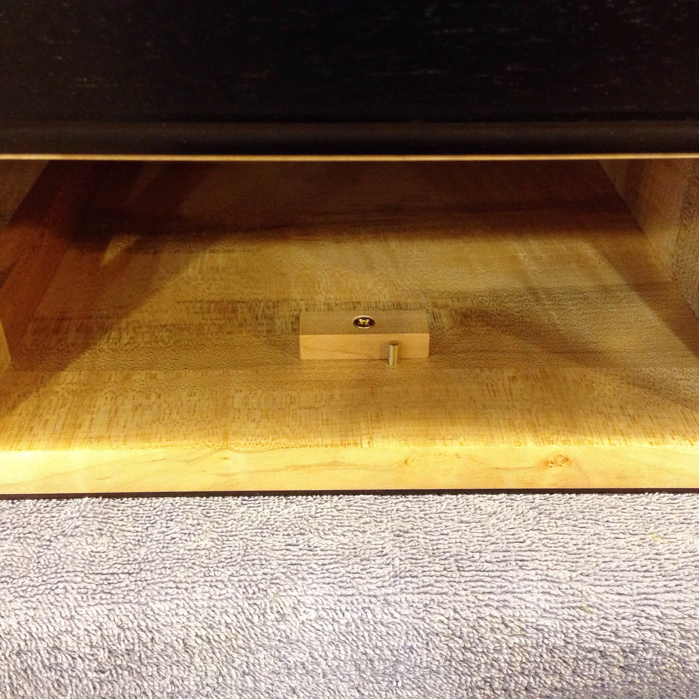 Sorry in advance for a kind of lame picture. I generally like to use some means of preventing drawers from being pulled out the whole way - this prevents someone from accidentally pulling the drawer out and dropping it (which happened to one of my pieces at a gallery). On the sideboard, I'm using spinners attached to the underside of the top. But this time I added a piece of 1/8" brass rod, which acts as a stop for the spinner (a stop for a stop, if you please). So instead of being able to turn the spinner freely (which can cause them to bind or unscrew themselves), the brass rod limits their range of motion to only 90 degrees. It's the little things.