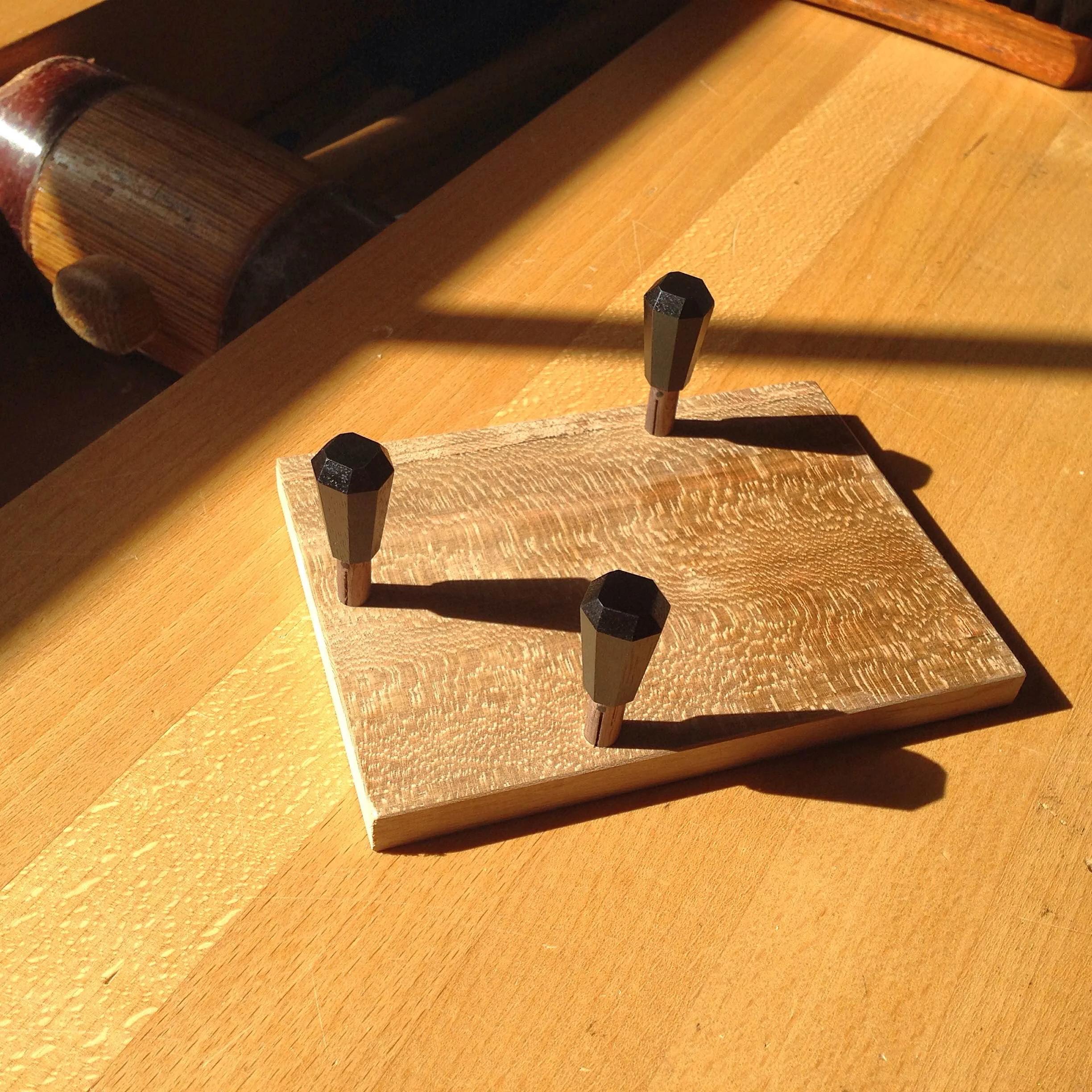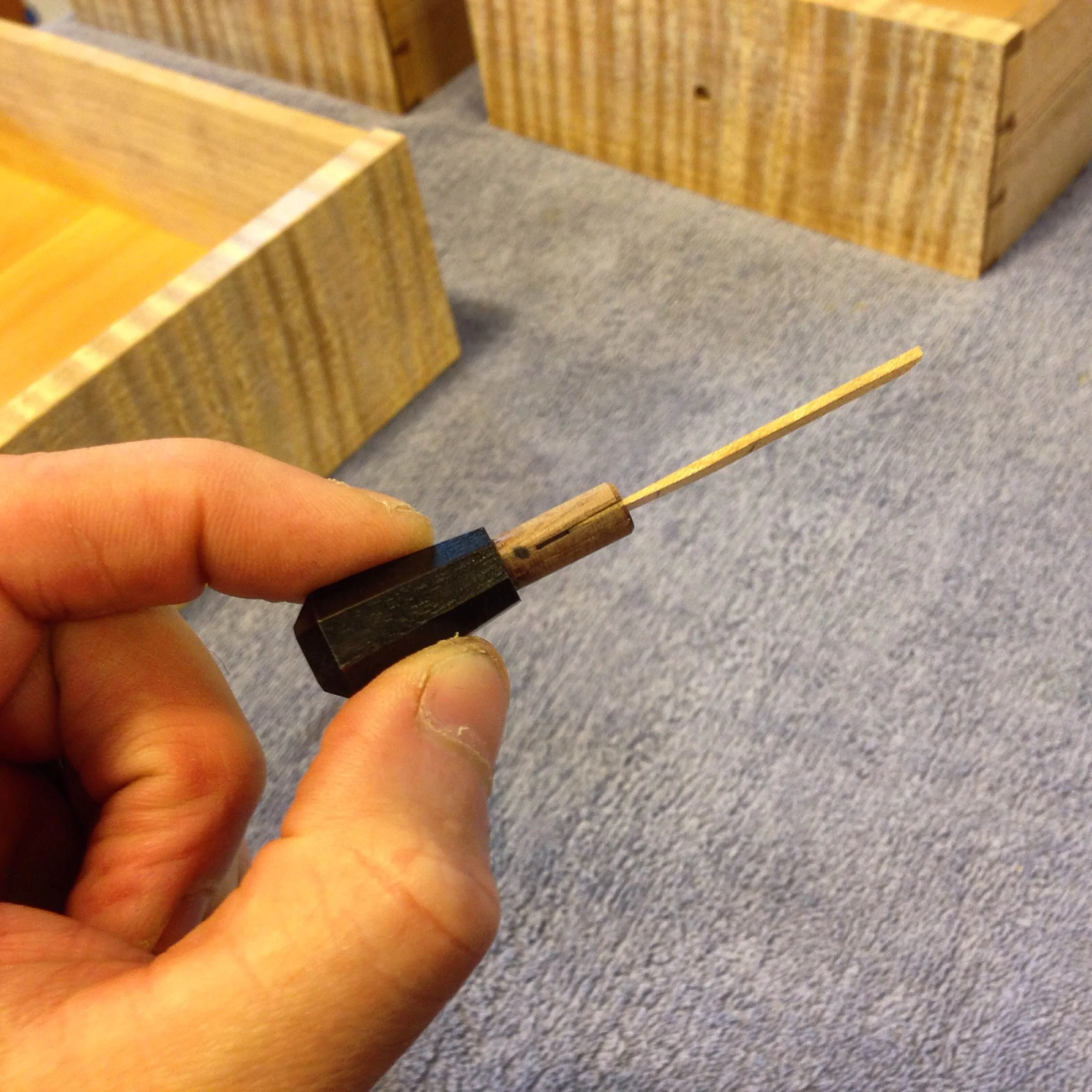 On the topic of drawers, pulls are pretty important. I like to fasten my pulls with wedges. I make the wedges from whatever thin stock I have on hand. In this case, some veneer left over from the case. I shape the wedges with a block plane, held stationary in one hand and pull/push the wedge over the block plane, like its a tiny jointer.
