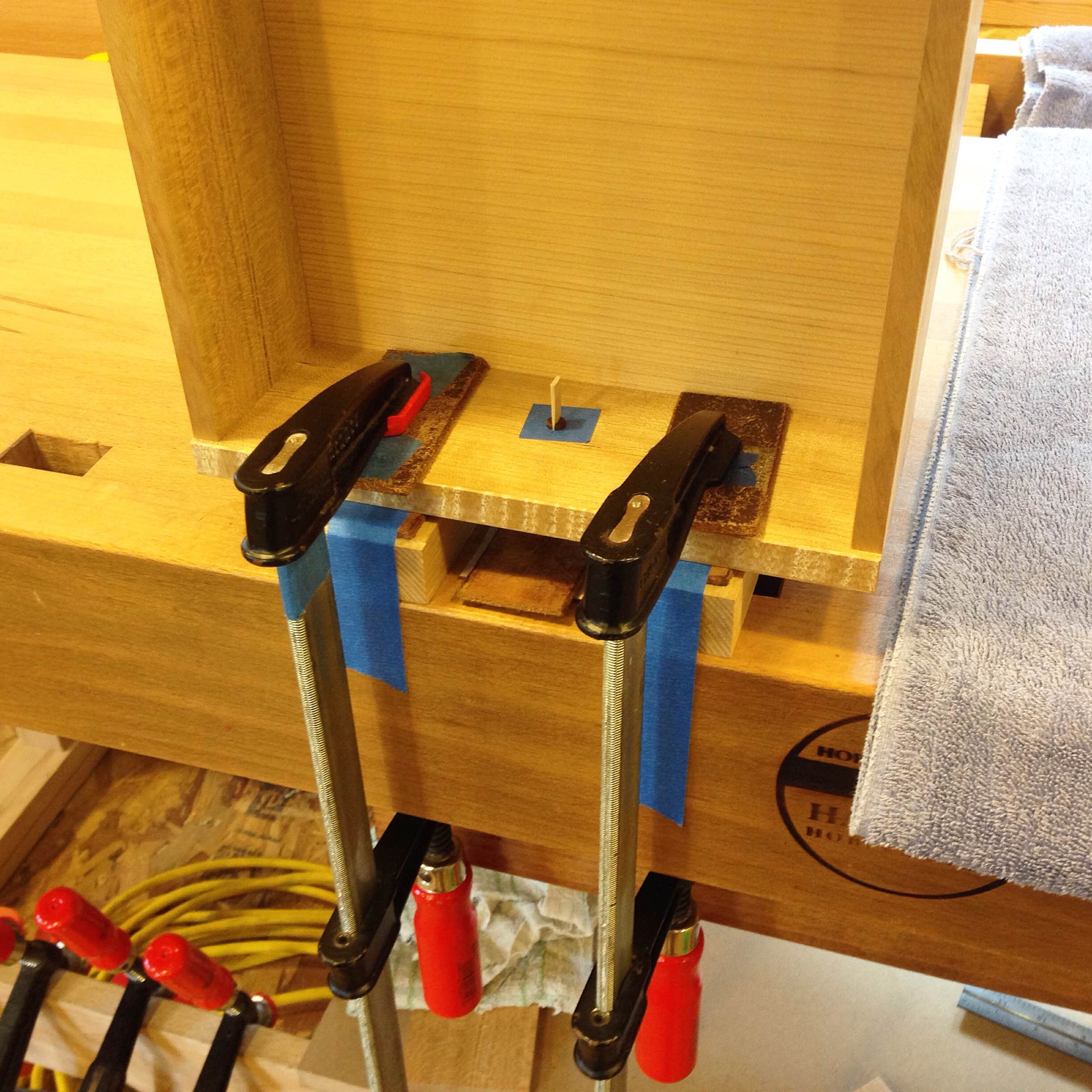 To attach the wedged drawer pulls, I use this setup to hold the pull against the drawer front while the wedge is driven from the inside of the drawer. The blue tape on the inside of the drawer makes for easy cleanup of glue squeeze out. After giving the glue a chance to cure, I cut the wedges off and clean up the cuts with a sharp chisel. I leave the ends of the tenons proud of the inside drawer face. Not too much, just enough to say "hey, look here, there's something kind of interesting here."