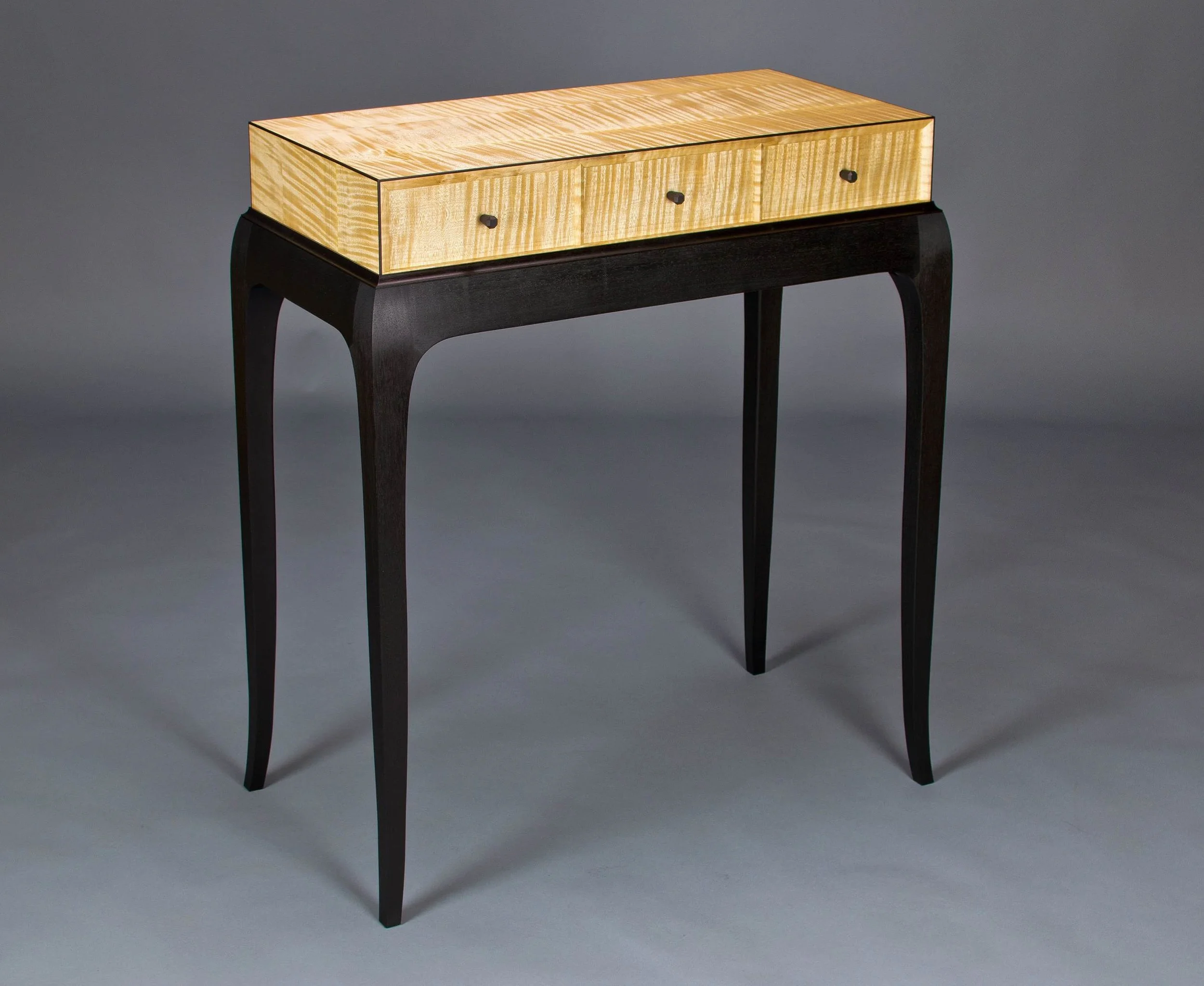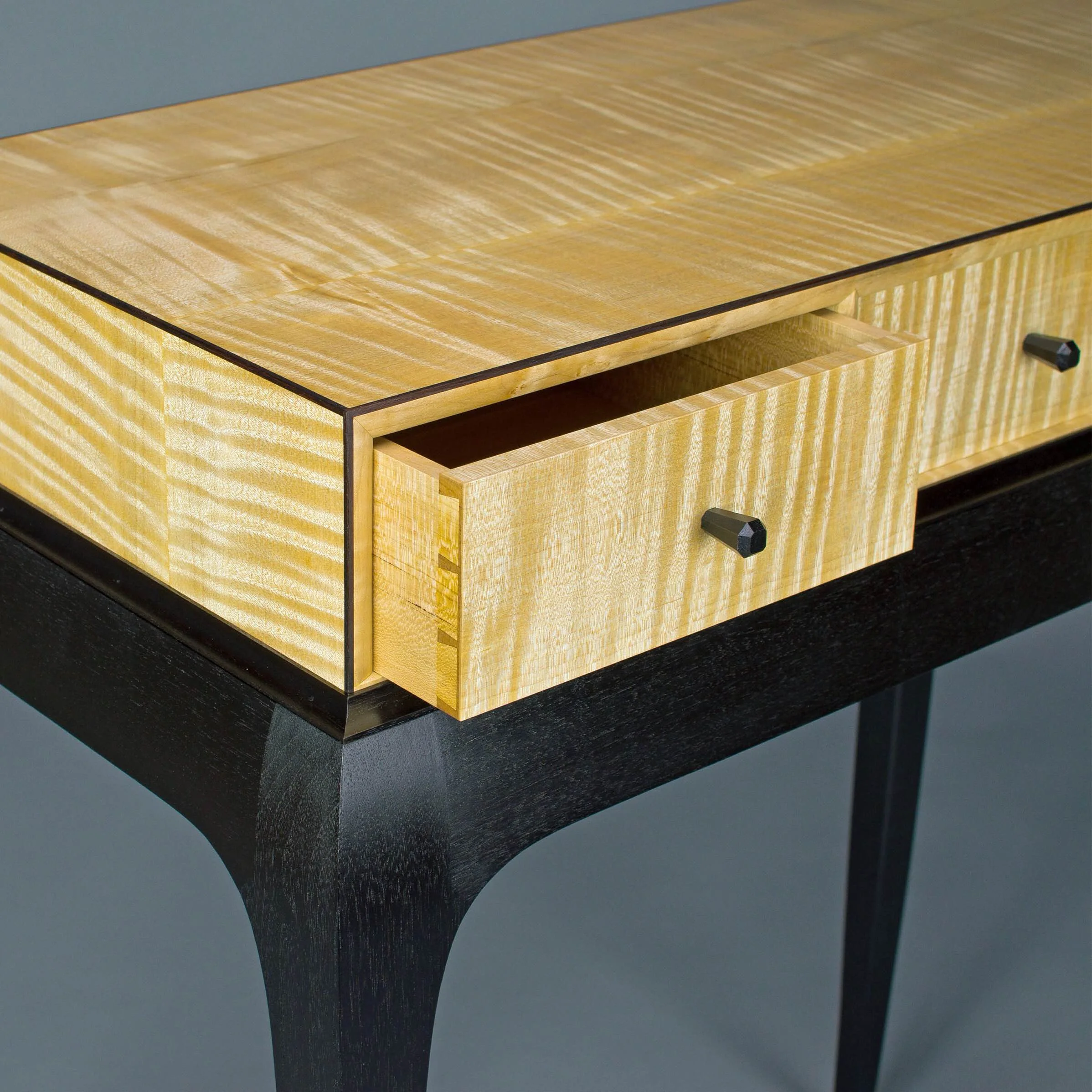 The sideboard is finished. I'm calling it En Pointe. The materials used are curly maple, ebonized walnut, rosewood. The interior drawer parts utilize quartersawn cherry and western red cedar.