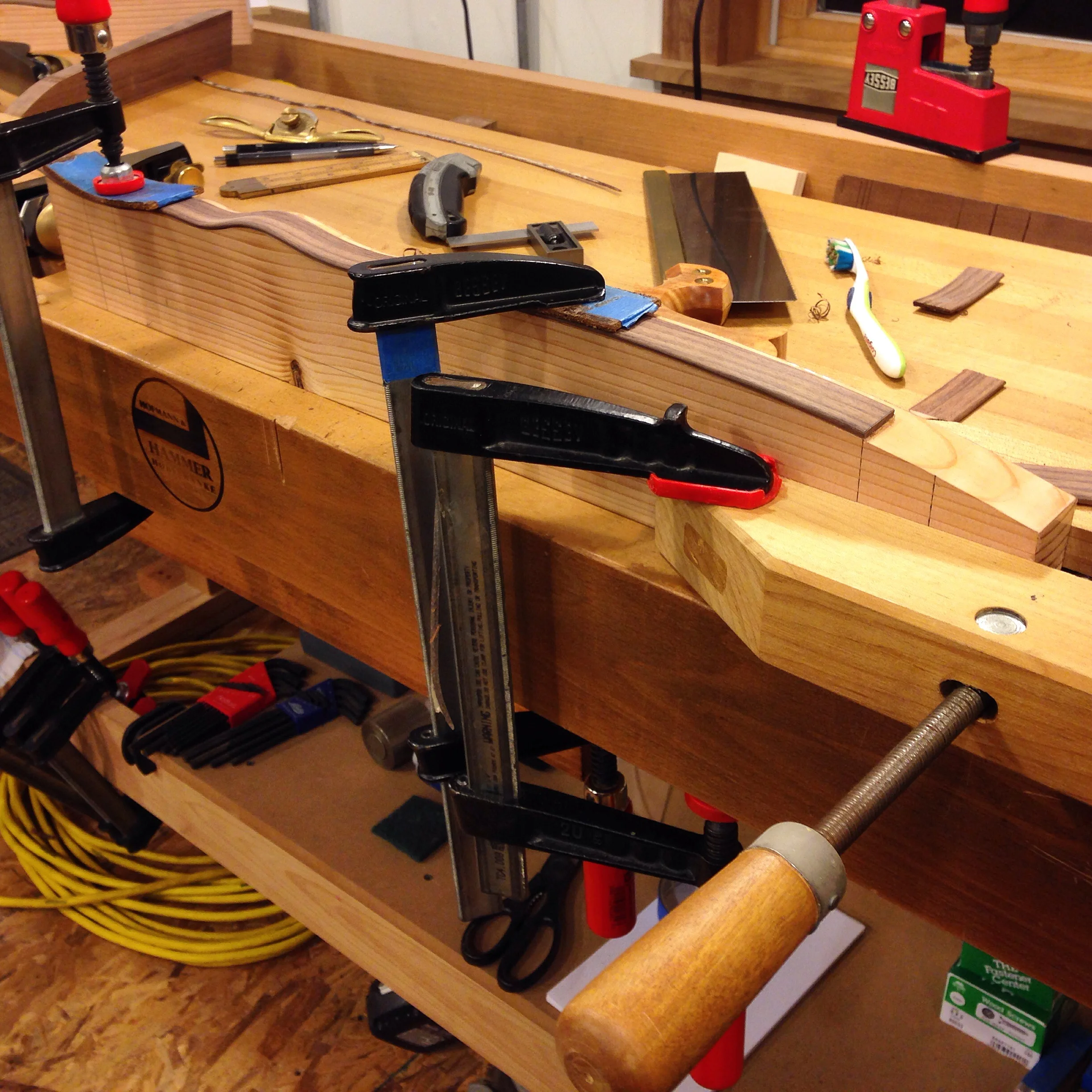I bent laminated the curvy bead stock a few posts back, and now it is time to clean them up, mill to size and shape the beads. With this small stock, it's easier to bring the stock to the hand plane (secured in a vise) than the other way around.